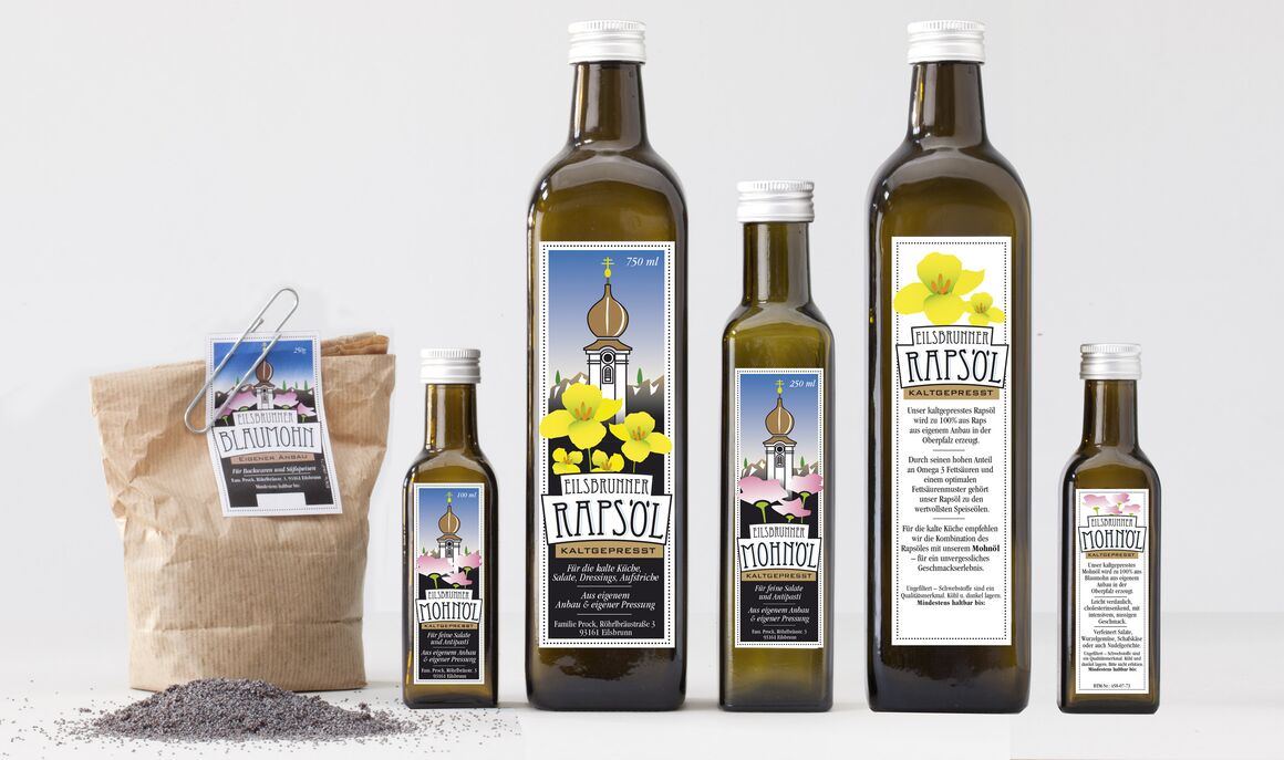 Mohn und Raps werden in Eilsbrunn bei Regensburg angebaut, zu feinem Öl verarbeitet und regional vermarktet. Optisch spiegelt den regionalen Bezug auch der markante Zwiebelturm der Eilsbrunner Kirche wieder.
